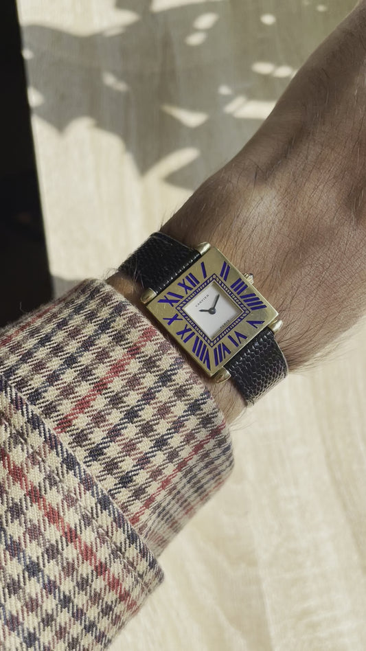 Cartier Paris 18k Gold Tank Obus "Quadrant" w/ Blue Enamel Numerals