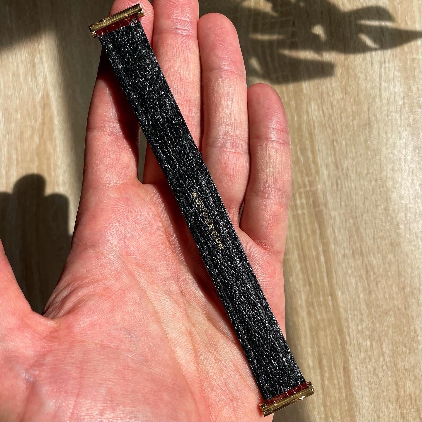 Strap/Bracelet: Unsigned black leather with additional original, unused period Boucheron brown leather strap (ends numbered P77xxx matching case)