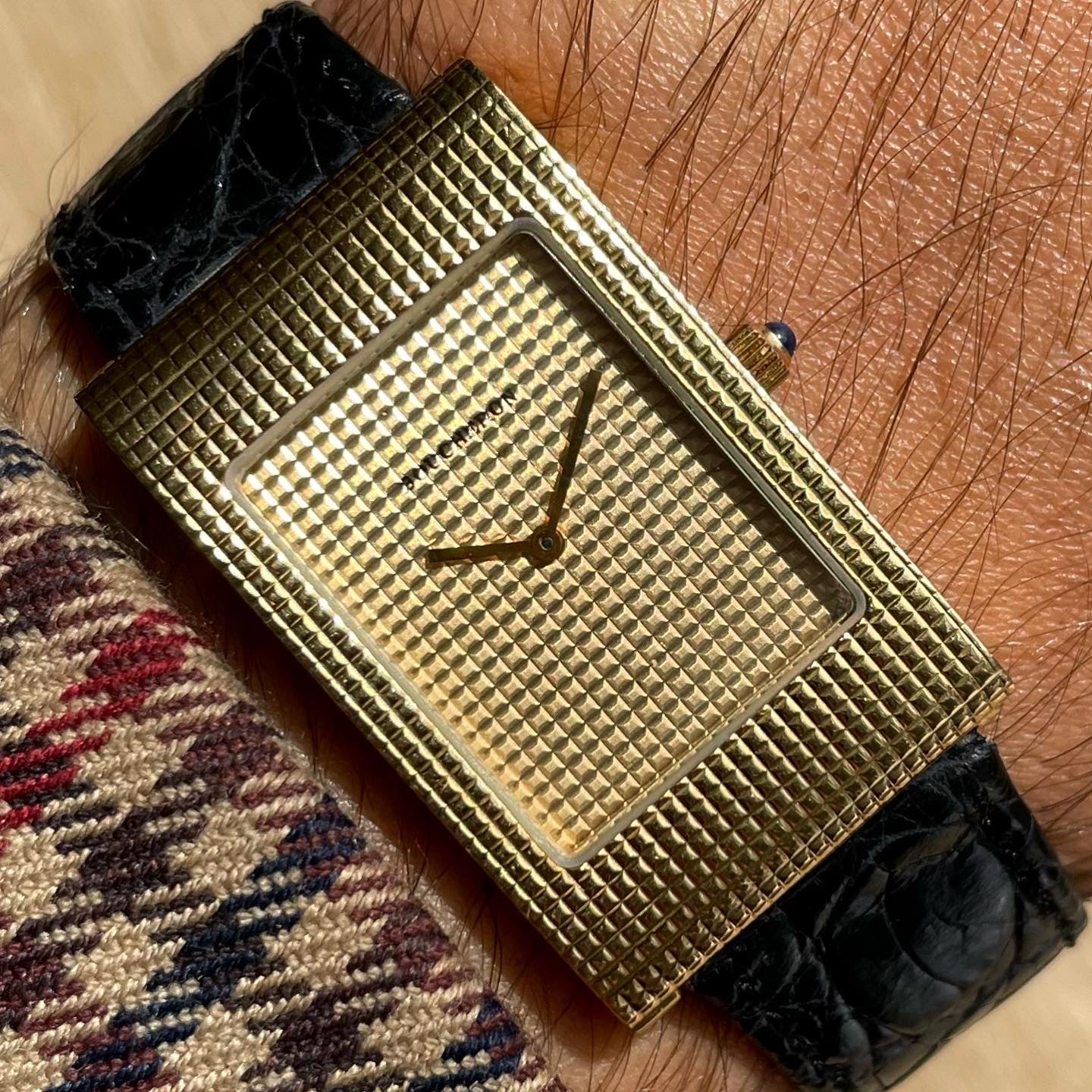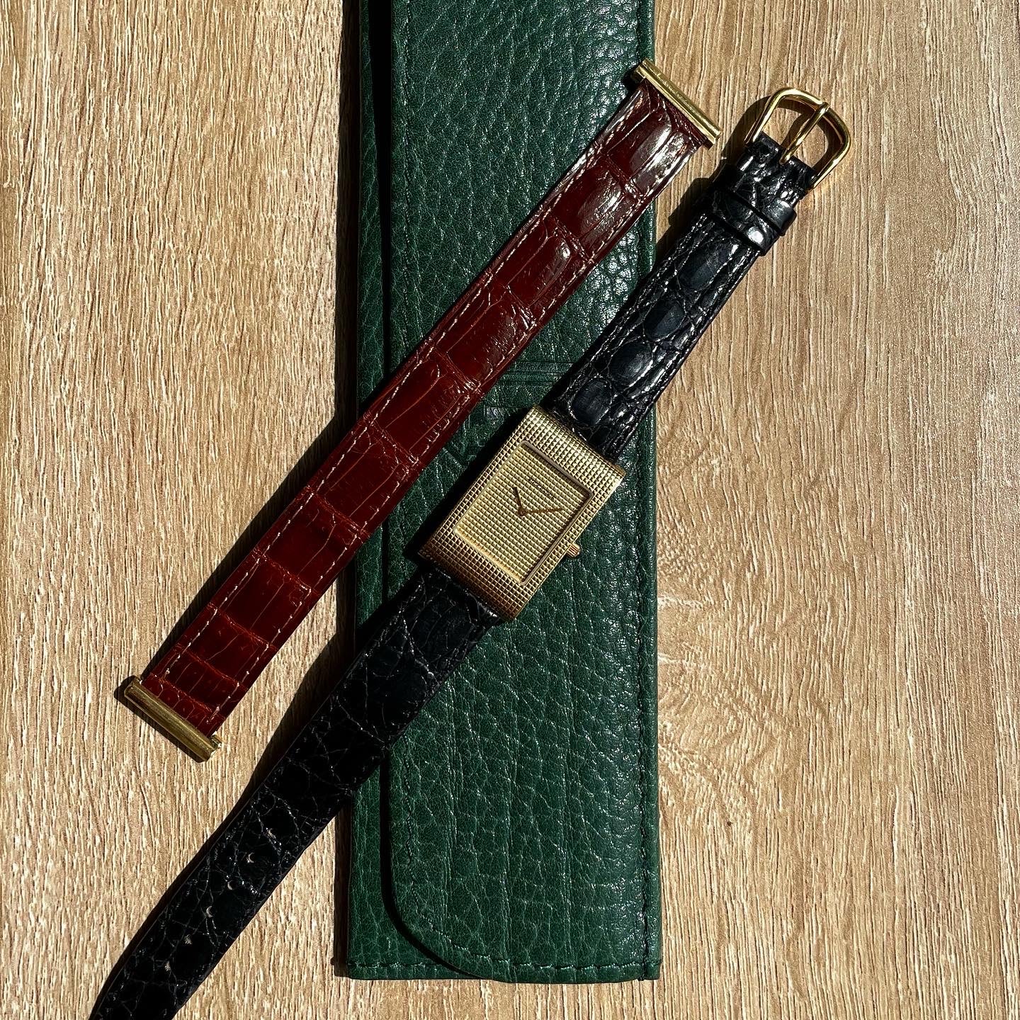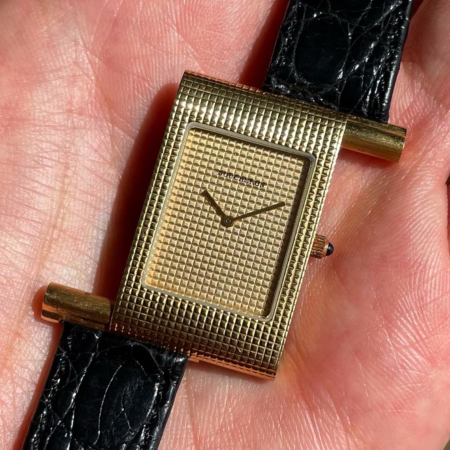 Alex's Comments: For me, this Boucheron Reflet is an incredibly chic and elegant 18k gold dress watch at a very attractive price-point. It's har This watch is a "late" example from the 1980s whilst retaining all its original design DNA that makes the Reflet somewhat of an icon amongst discerning circles. Fine vintage Boucheron dress watches have become more celebrated and rightly so, carrying the same originality of design and quality as the in-vogue Cartier and Piaget. The additional original, unused brown Boucheron strap is a lovely addition, and the Reflet's ingenious patented case and strap design allows for switching with ease.