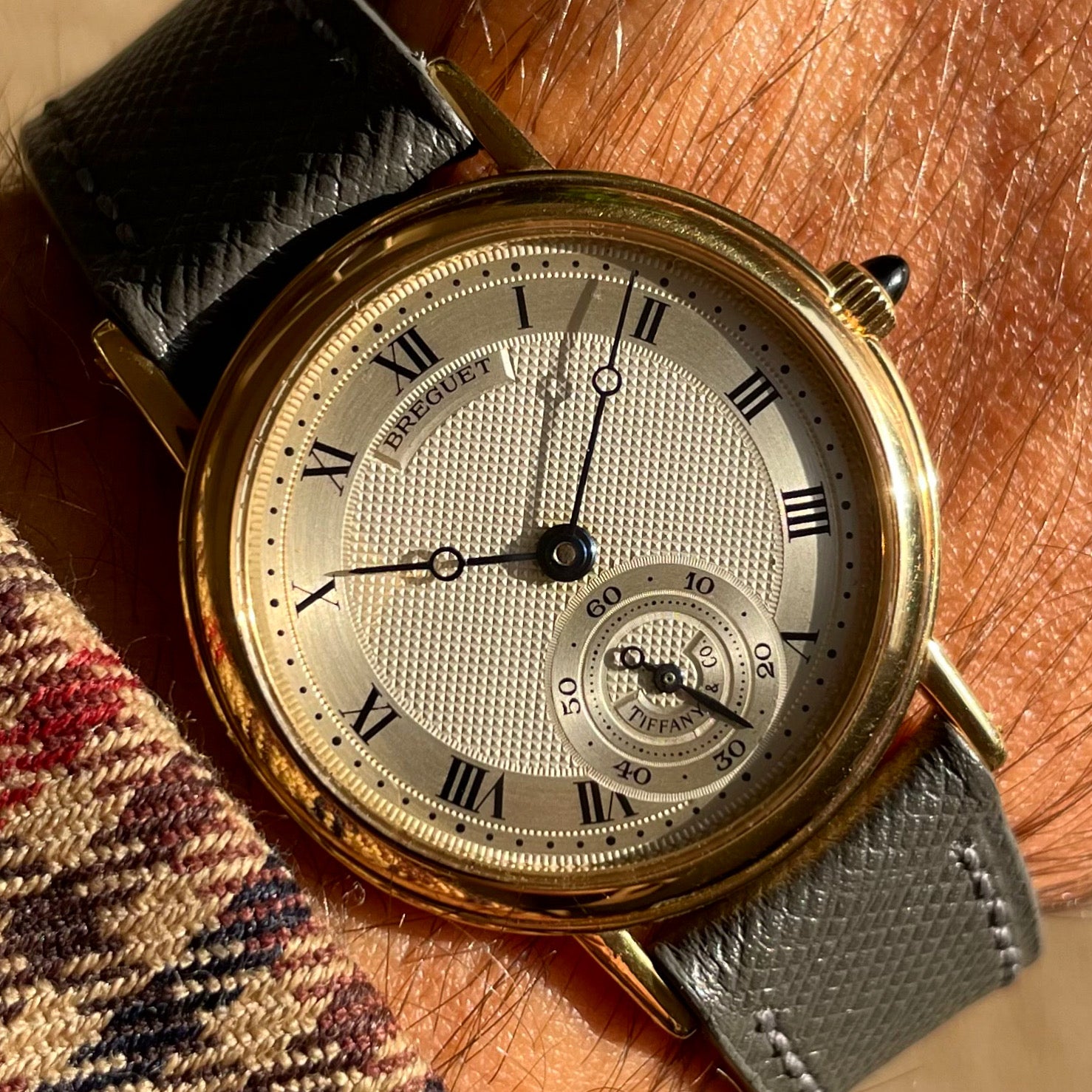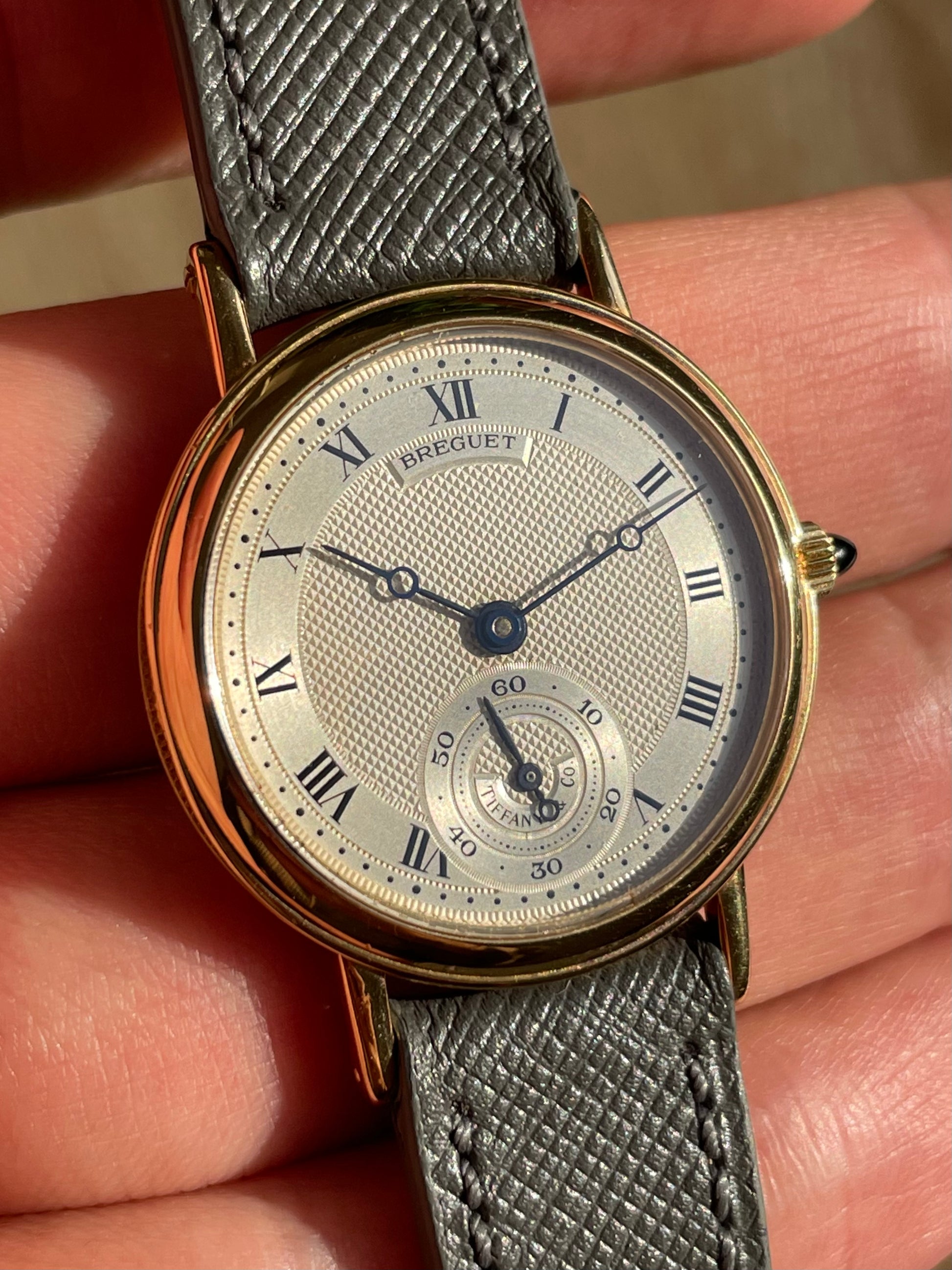 Alex's Comments: On a quick glance, this watch simply appears to be an undoubtably beautiful manual wind Breguet in its own right. But look closely... This is not your typical Breguet - this example was retailed by Tiffany & Co, and features a Tiffany & Co signature within the subsidiary seconds dial. Housed in an elegant "coin-edge" case with a cabochon sapphire crown, this is a fine and rarely seen example of one of Breguet's most iconic models.