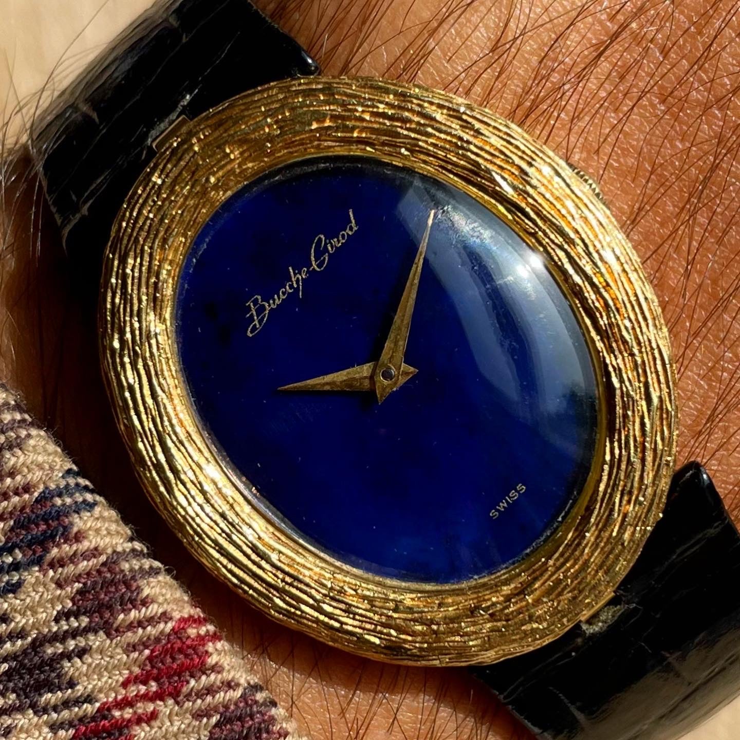 Bueche-Girod 18k Gold Large Oval Bark-Finish Watch w/ Lapis Lazuli Dial (Possible Roy King collaboration design)