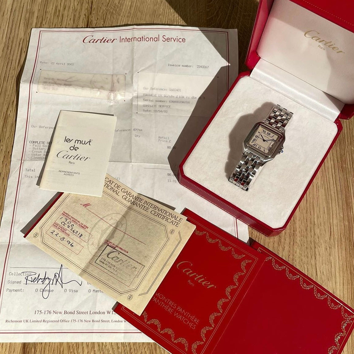 This particular Panthère is a "jumbo" (29mm width) reference 1300 in steel, and dates to 1996. The watch is a timeless icon and is an effortlessly elegant option for both men and women. This example is accompanied by its original box, papers (showing purchase at Cartier New Bond Street in 1996), booklets and Cartier service paperwork (dated 2002). It has a very large bracelet that will easily fit the largest of wrist sizes.