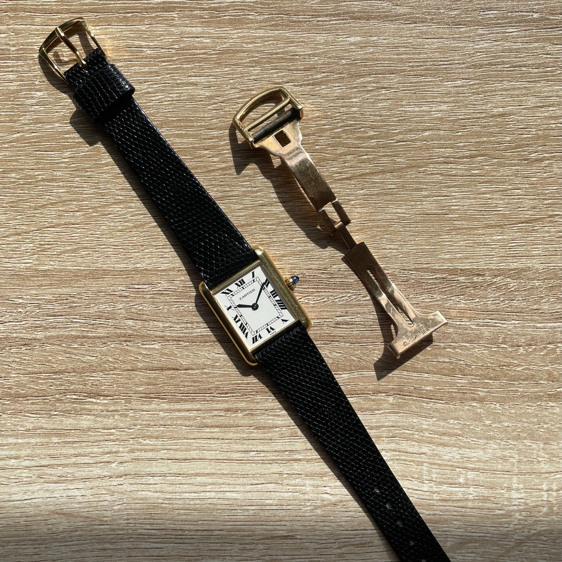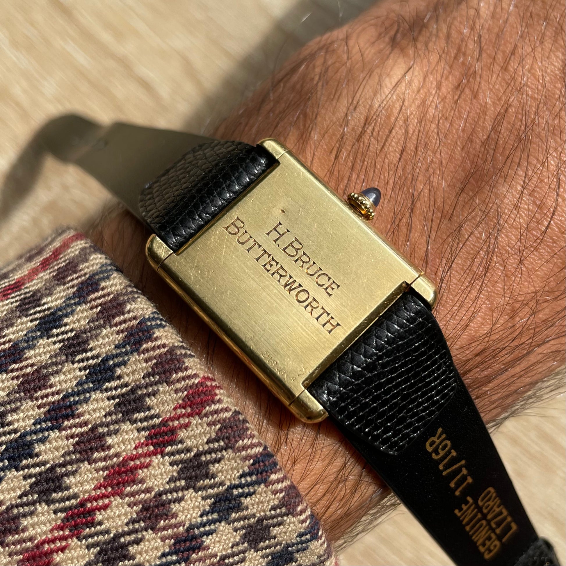 This particular Tank Louis is a mechanical example in 18k solid gold, and dates to the 1970s. It features its original Paris-signed dial, along with all the quintessential Tank DNA like classic white dial with black Roman numerals, blued steel hands, cabochon sapphire crown and the like. The case is signed Cartier, numbered, and hallmarked, and houses inside a 2512 manual wind calibre signed Cartier. There is an engraving present to the case back reading "H. Bruce Butterworth", a nod to the past life this watch has led. The watch is twinned to an unsigned black lizard strap with generic pin buckle, but is also supplied with its 18k solid gold Cartier deployment clasp (total weight approx. 11.6 grams), should the new owner wish to utilise this on a different strap.