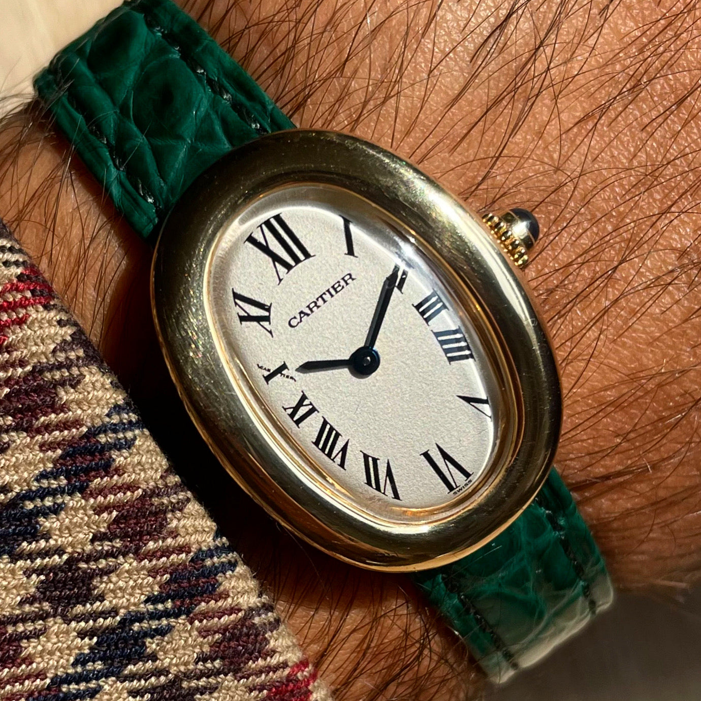 The Cartier Baignoire is an elegant and chic oval-cased watch named fittingly after the French word for "bathtub". The model was released in 1957 and has changed very little over the course of its lifetime, remaining one of Cartier's iconic, timeless designs. The Baignoire has been the choice of many French glamour icons such as Catherine Deneuve, Romy Schneider and Jeanne Moreau.