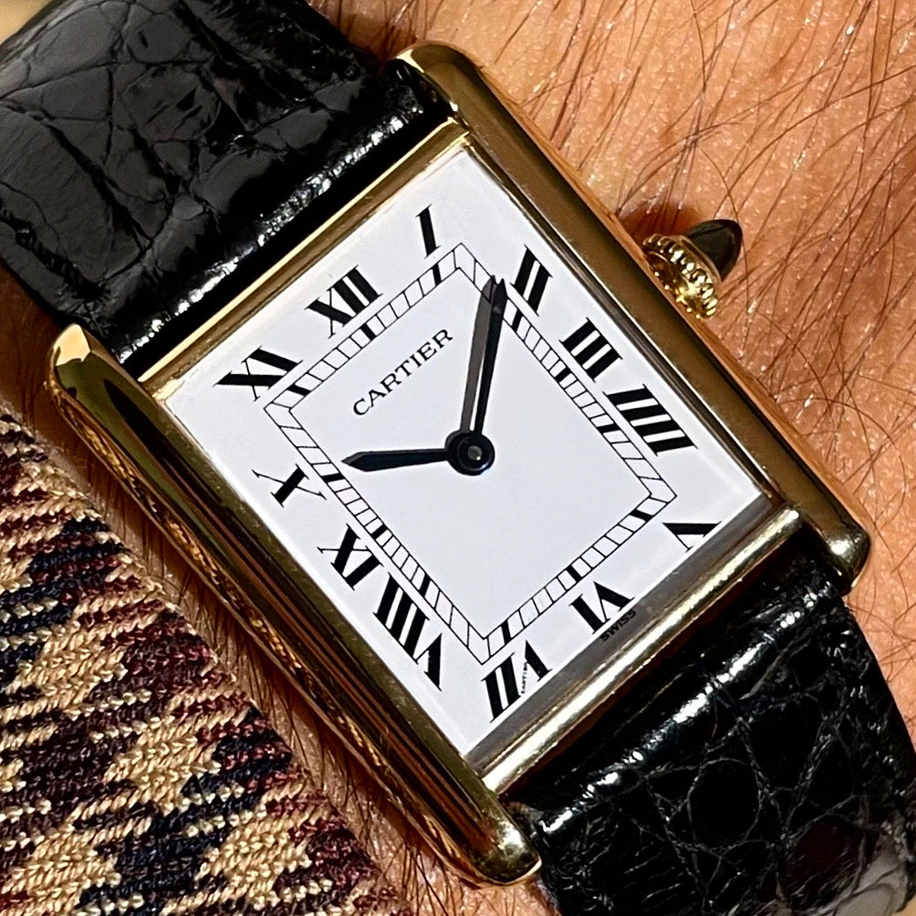This particular Tank Louis is a mechanical example in 18k solid gold, and likely dates to circa 1980. The watch features all the quintessential Tank DNA like classic white dial with black Roman numerals, blued steel hands, cabochon sapphire crown and the like. The case is signed Cartier, numbered, and hallmarked, and houses inside a 2512-1 manual wind calibre signed Cartier. This watch was likely made for export to the US market, as shown by its "Swiss" signed dial and hallmarks to the case side. The watch is twinned to a black leather strap with a period gold-plated Cartier pin buckle.