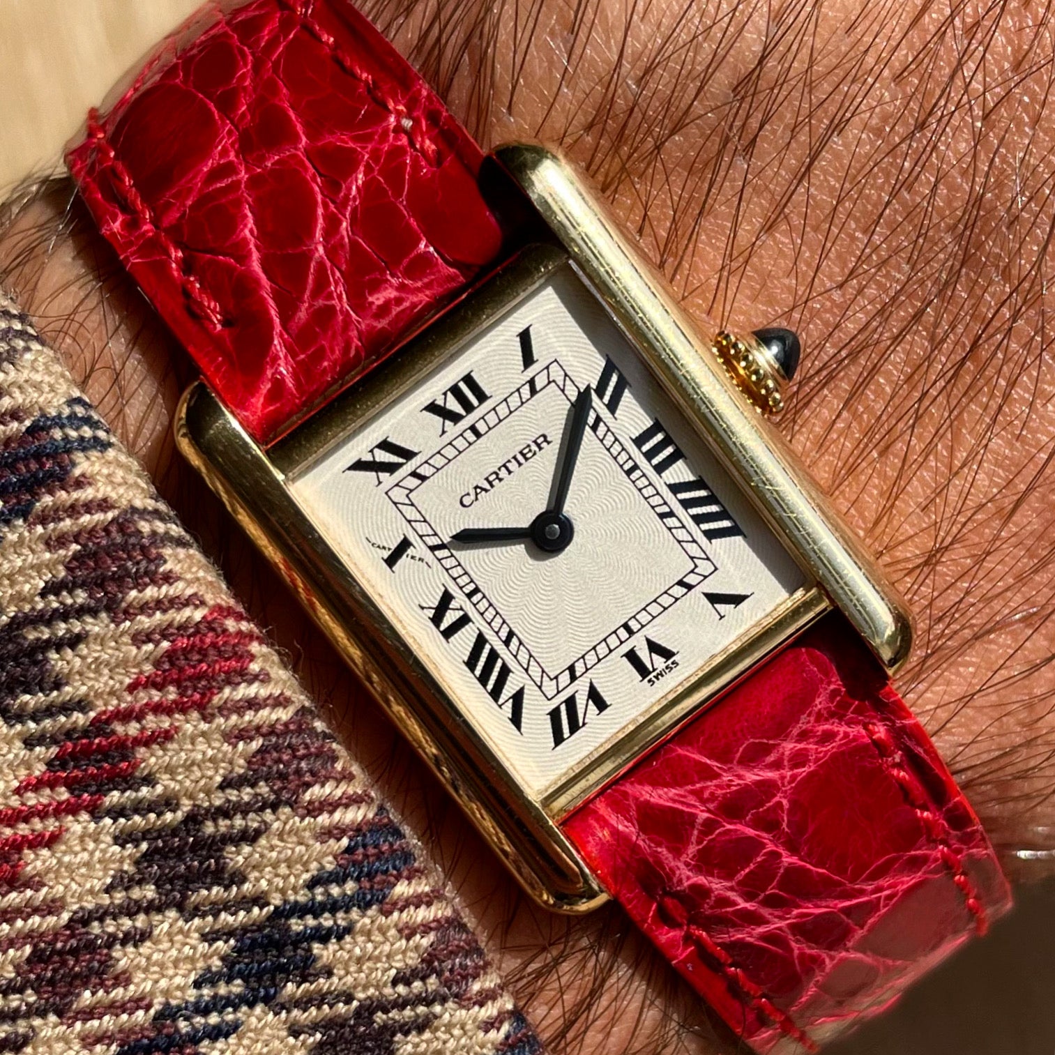 The overall condition of this example is very good. The dial is in excellent condition, the case is very good with light surface scratches commensurate with age. The watch comes on a Cartier red leather strap and gold-plated Cartier pin buckle.