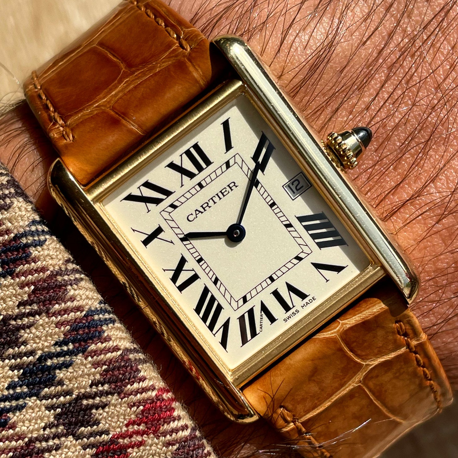 This particular example is a ref. 2441 (W1529756) in 18k solid yellow gold, and features all of the quintessential Tank DNA along with a slightly larger case at 25.5mm by 33mm (the Tank Louis is typically 23mm by 31mm) along with a date window for modern day tastes. It is accompanied by its box, papers and purchase receipt.