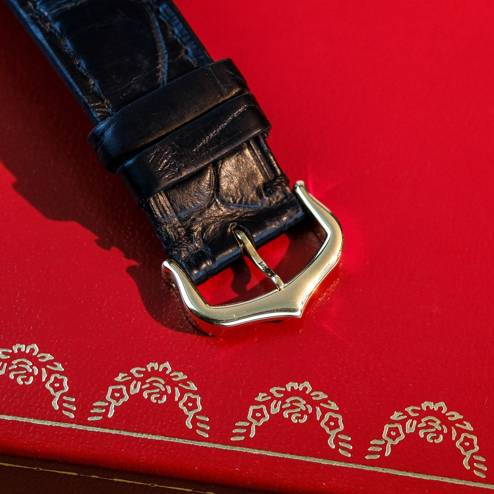 Strap/Bracelet: Black Cartier leather w/ 18k solid gold Cartier pin buckle