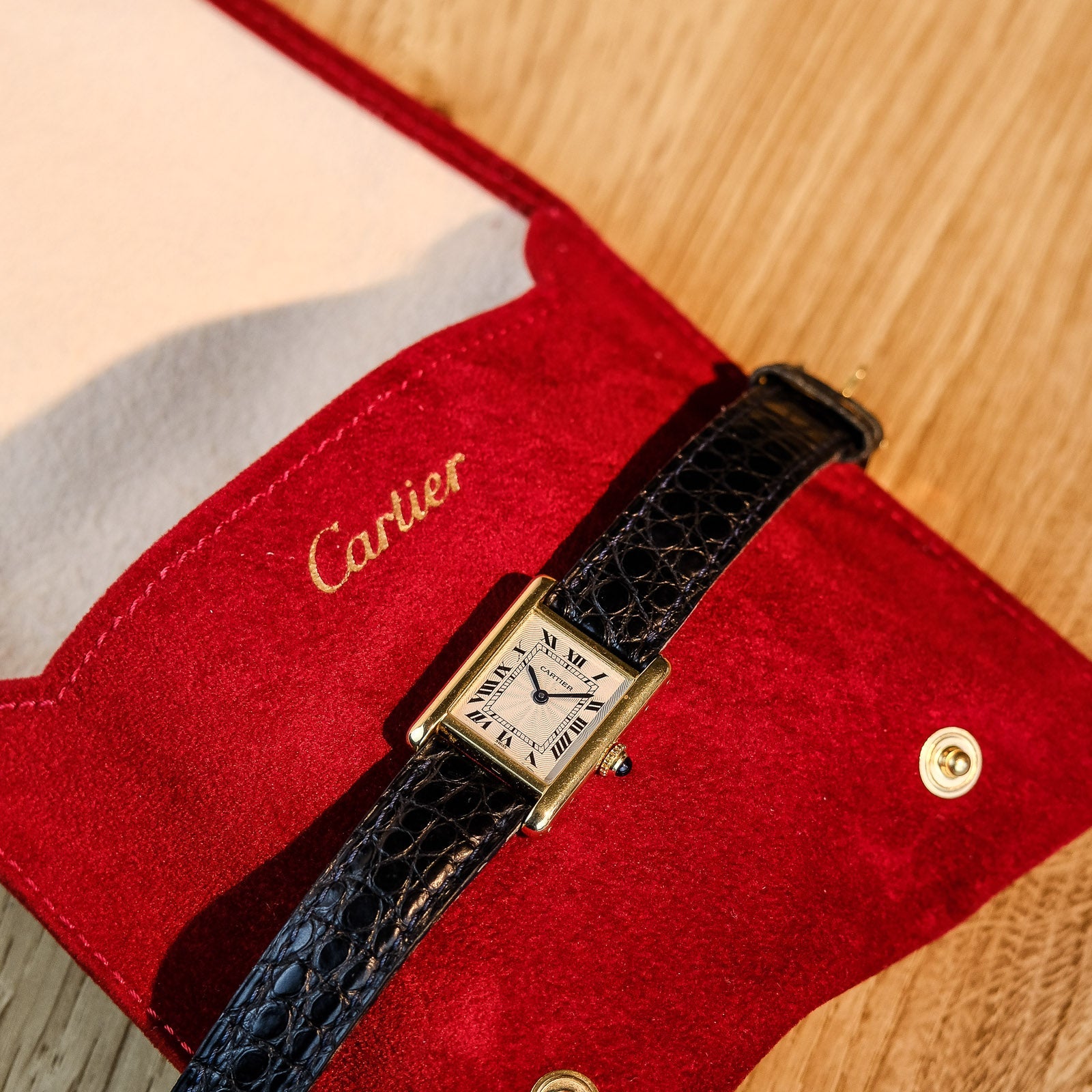 Alex's Comments: Mechanical Tanks with guilloché dials are not very common outside of the CPCP (Cartier Paris Collection Privée) range, but this unusual and seldom-seen mid size Tank is an exception to that, particularly in this price range. For me, it's the very attractive guilloché dial that makes this watch a very chic choice for both a fine lady or gentleman with a taste for a smaller sized Tank.