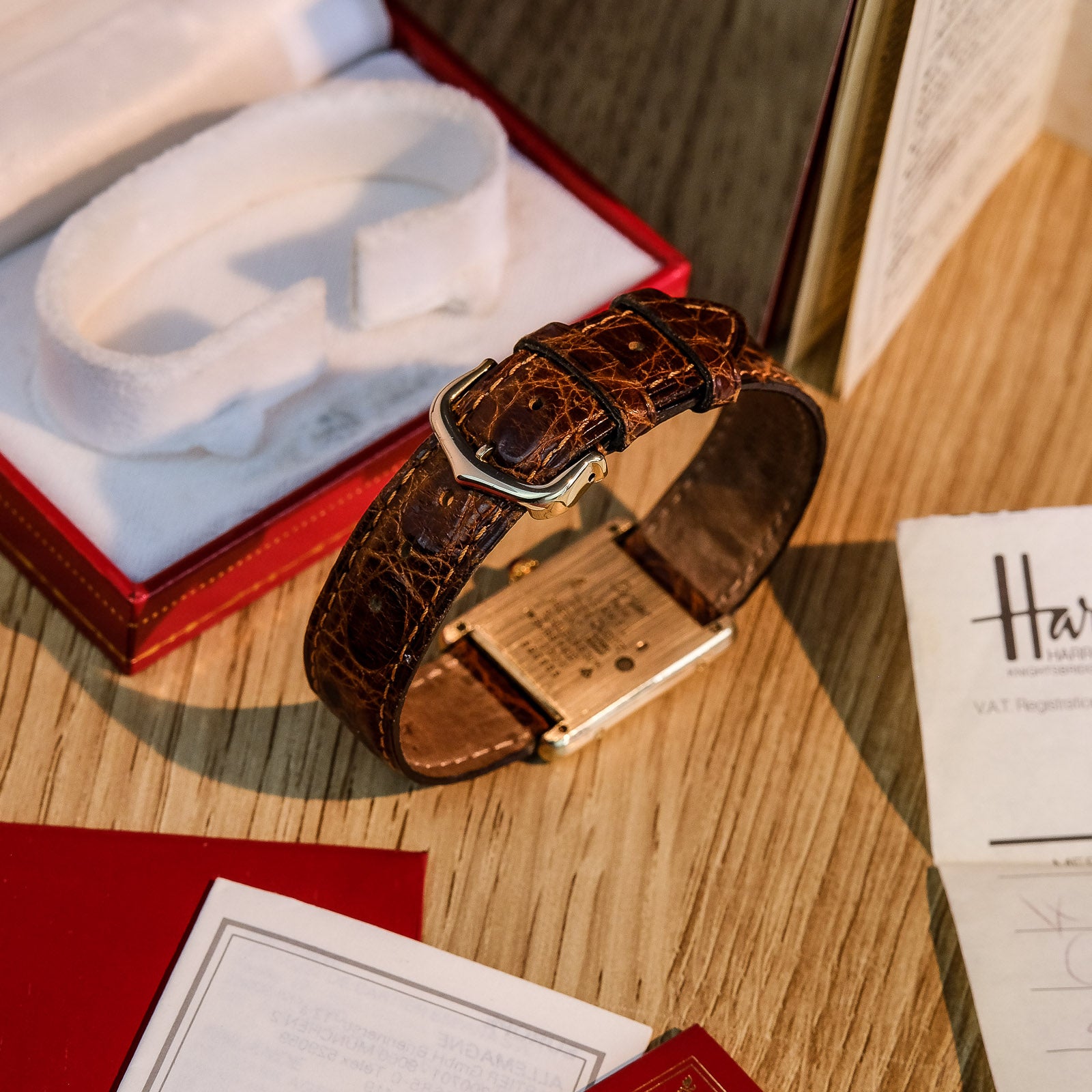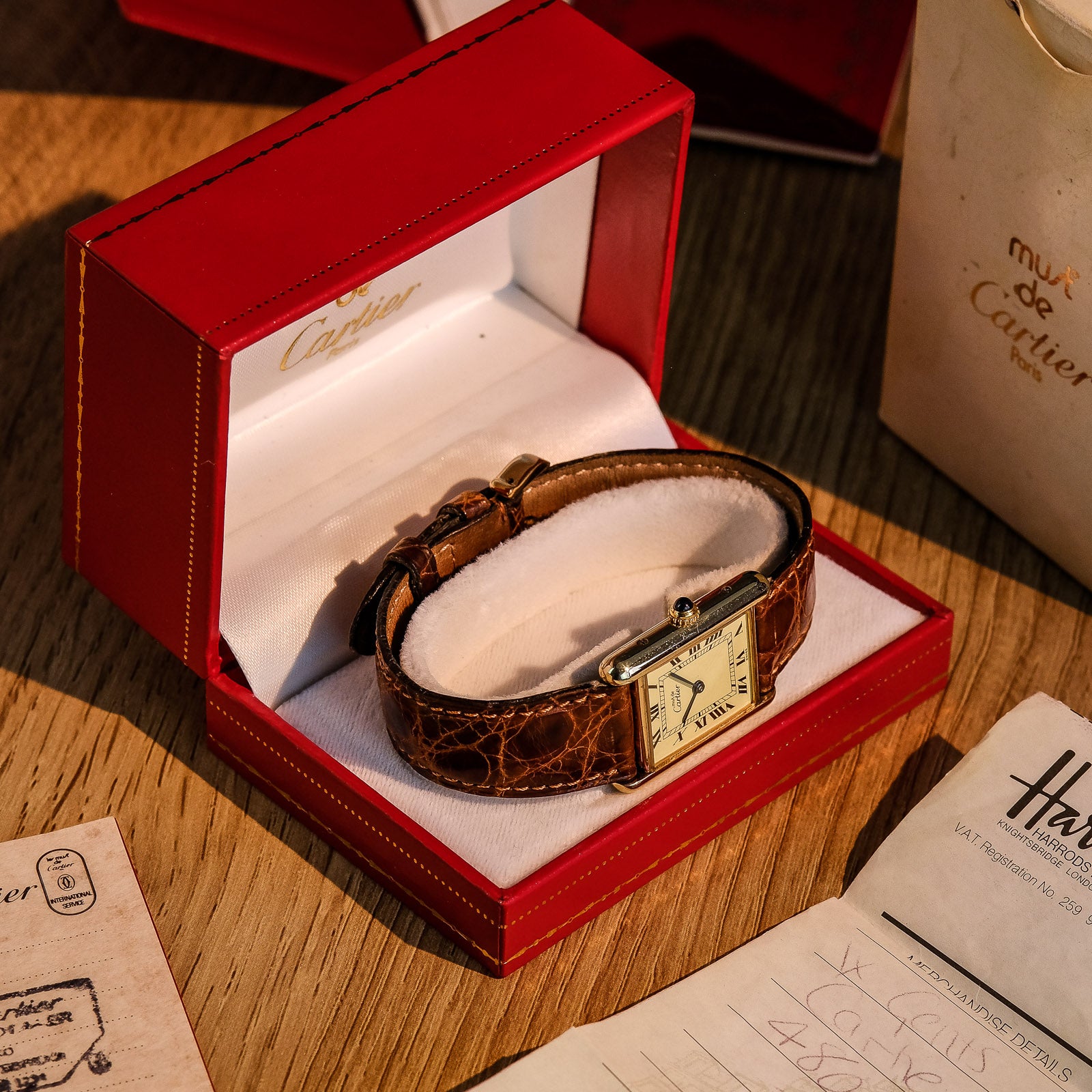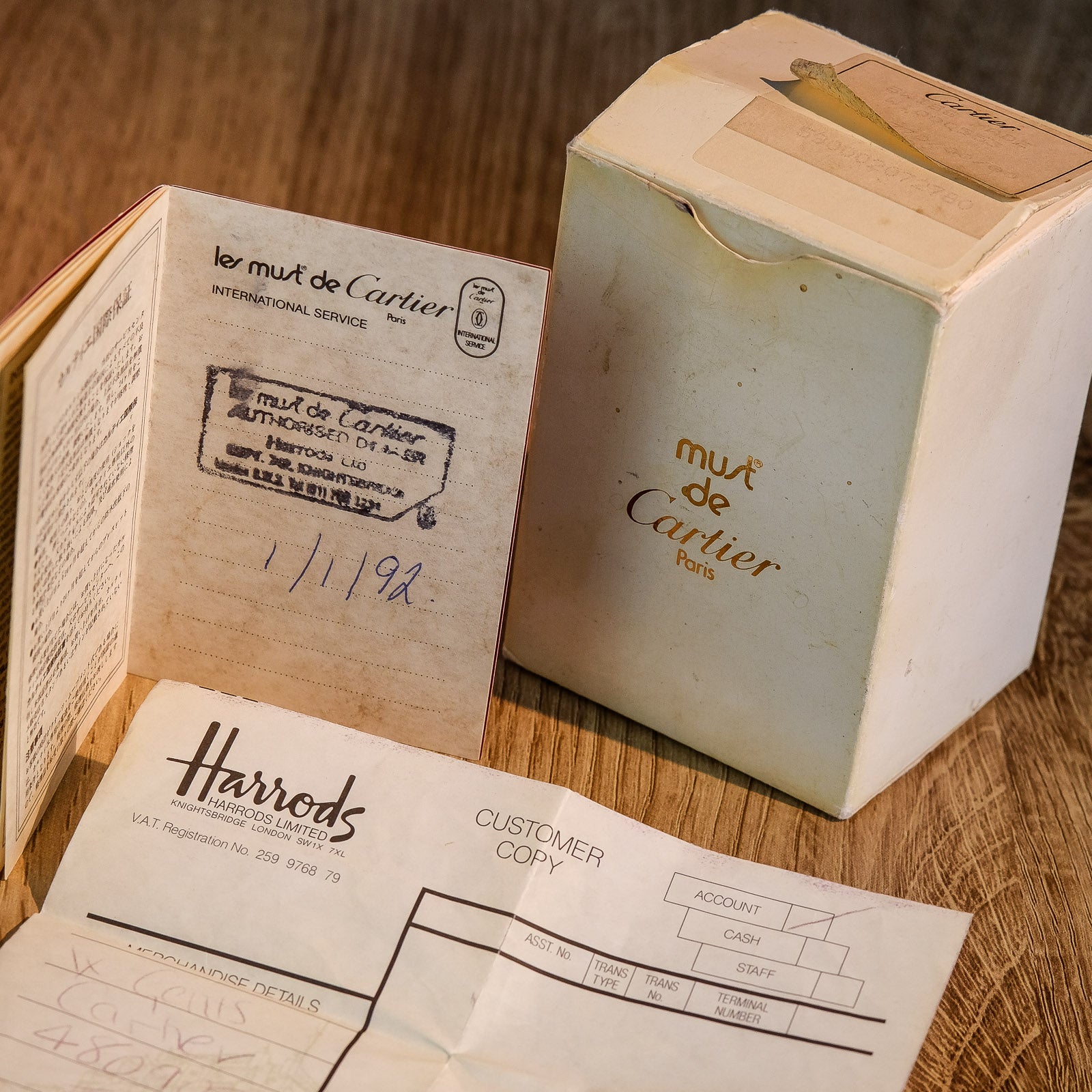 Alex's Comments: Must de Cartier Tanks are a staple here at ASV and for good reason, being a great entry point into the world of vintage Cartier and one of history's most iconic watch designs. This particular example though is somewhat of a cut above, complete with its original outer box (with stock sticker still applied), inner box, booklets, papers and even its original purchase receipt from Harrods in 1992. A well-preserved watch that is ready to strap to the wrist and enjoy.