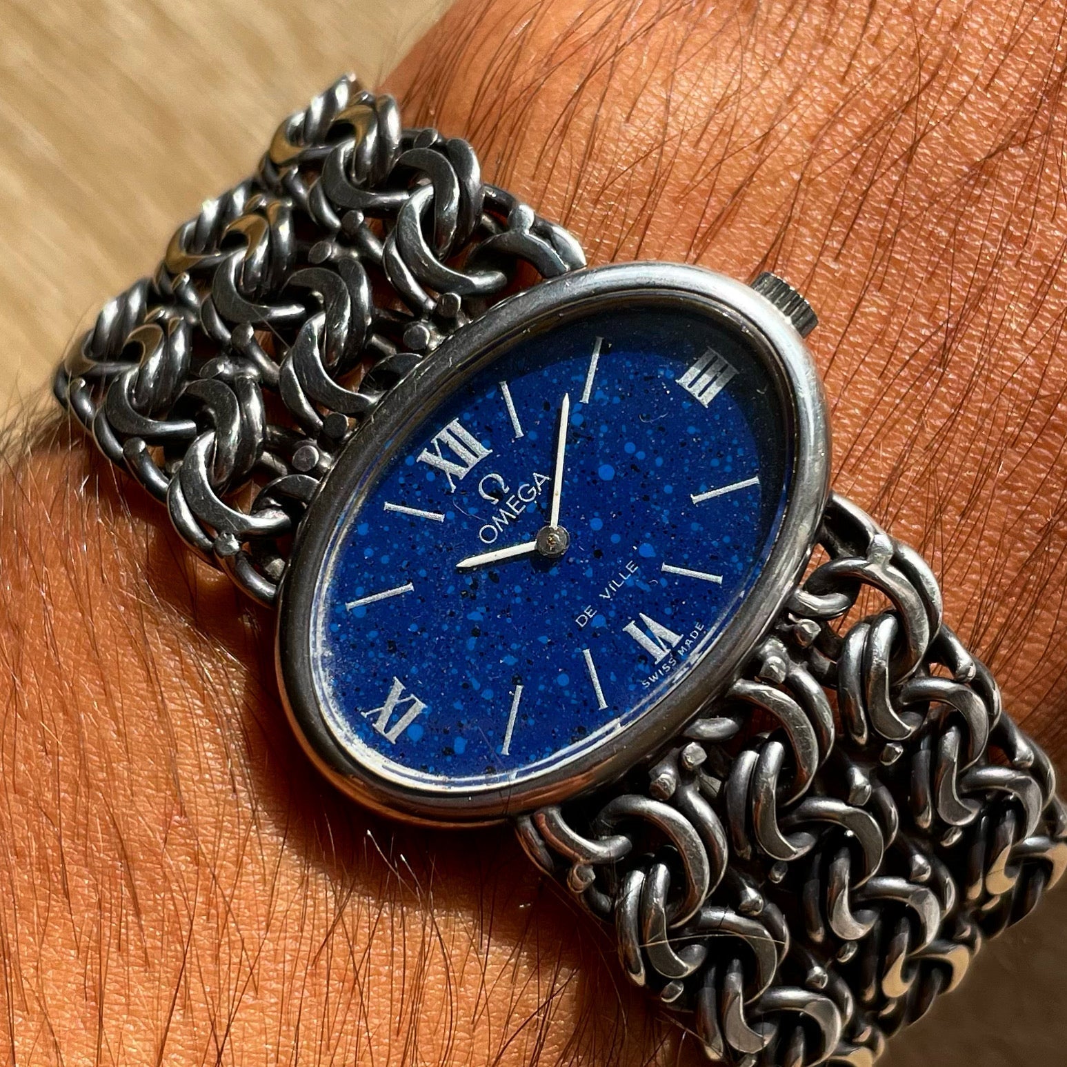 This very unusual Omega De Ville in solid silver features a vibrant blue enamel dial and an integrated chainmail bracelet in the style of other Andrew Grima designed Omega De Ville watches from the period. During my research I have been unable to find any similar examples to this one, particularly with this dial. A wonderful statement piece!