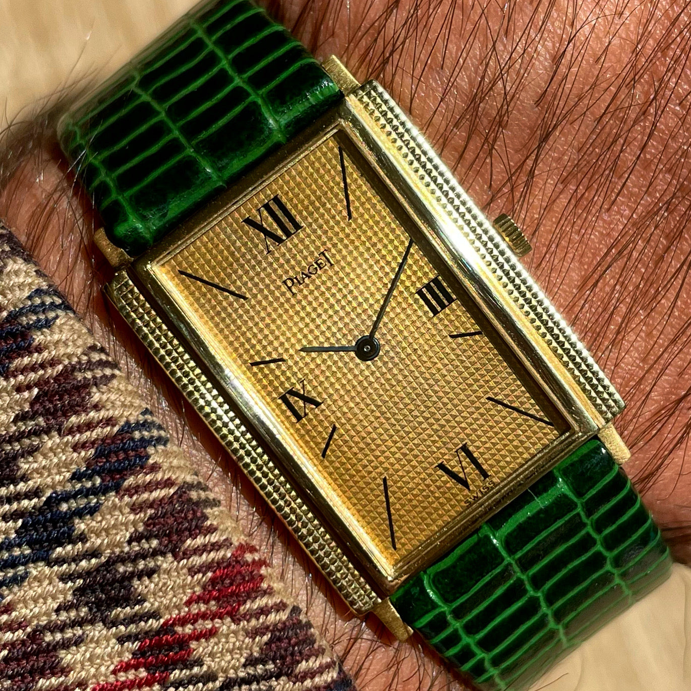 This particular example is a "Tank" ref. 9212 from the 1970s in 18k yellow gold with an attractive Clous de Paris or "hobnail" dial and case finish. This elegant, slim watch features Piaget's 9P manual calibre movement. At 23mm wide it is the same as a Cartier Tank Louis, whilst a little longer 34mm, making it very wearable. The aforementioned Cartier equivalent from the same era would be around 3 times the price, making this Piaget - and Piaget as a whole - excellent value for watches both quality and rare.
