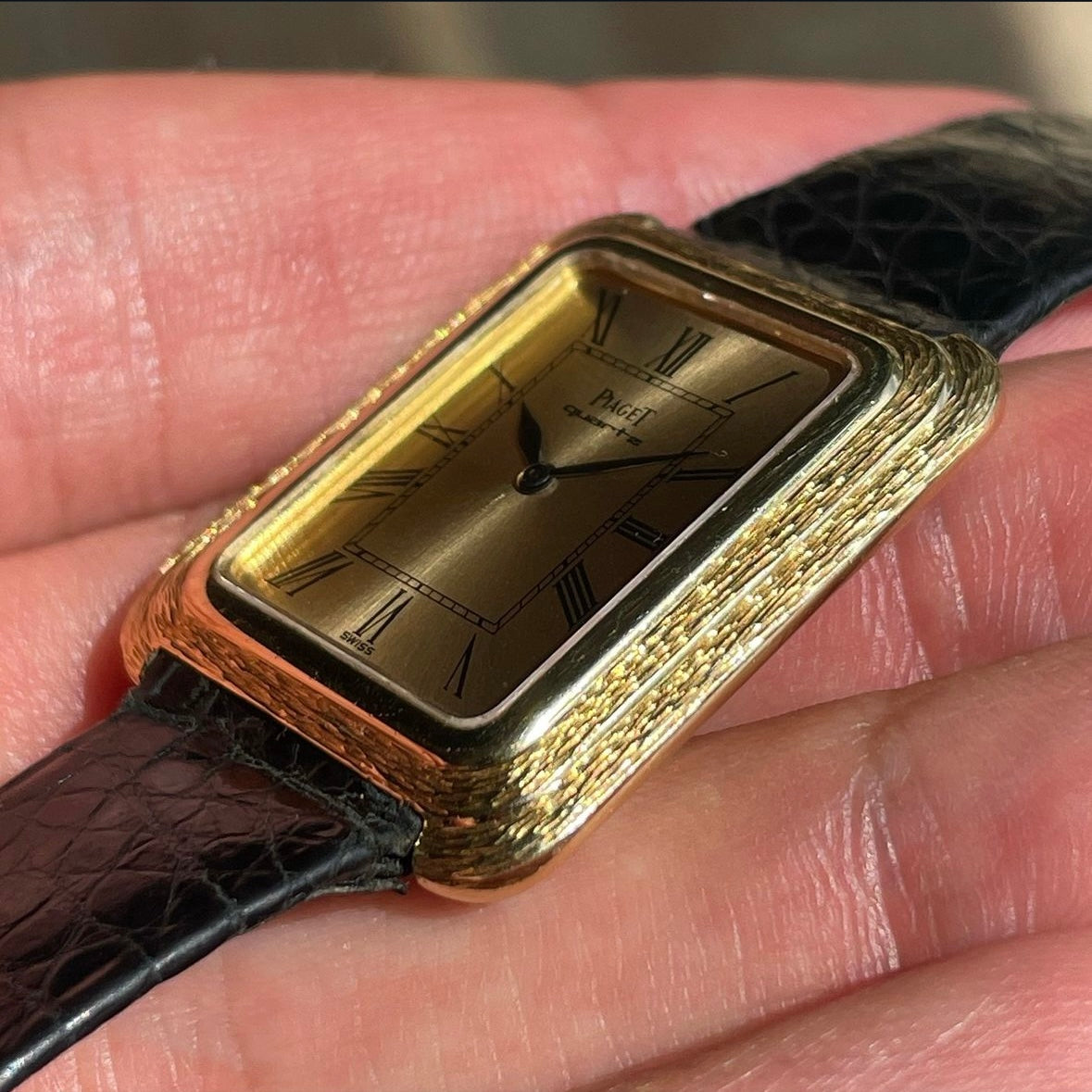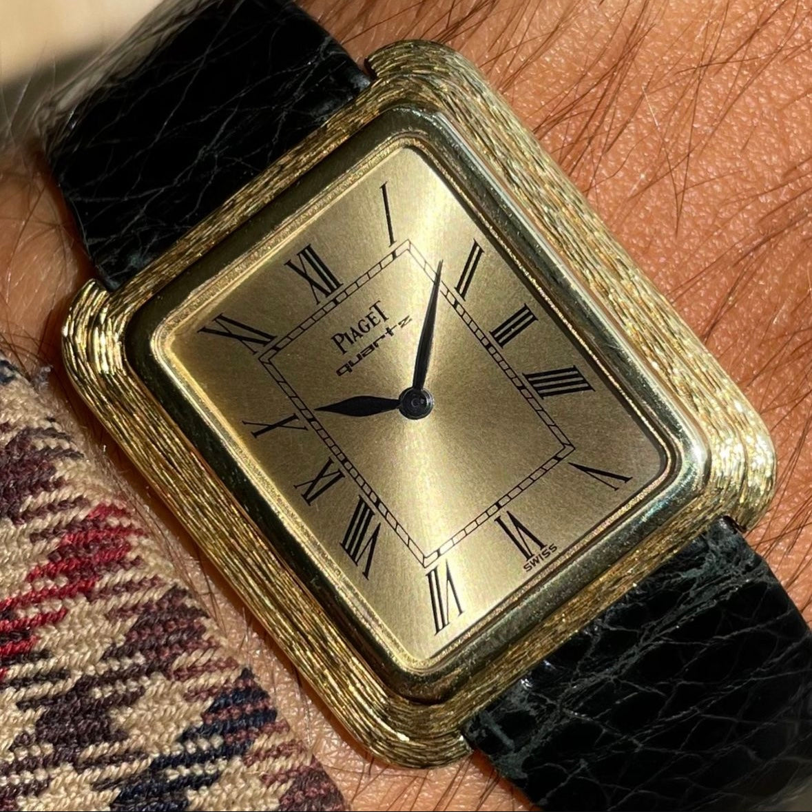Alex's Comments: The fact one can still buy an 18k solid gold Piaget for just over £2500 speaks to the value still available in vintage Piaget, despite the brand's recent rise in appreciation and interest. This particular piece is both elegant yet slightly funky with its stepped case and bark-finish, and a great option for men and women. It's also benefitted from a recent 2024 Piaget London service at the cost of £560. Overall, an attractive watch and value proposition.