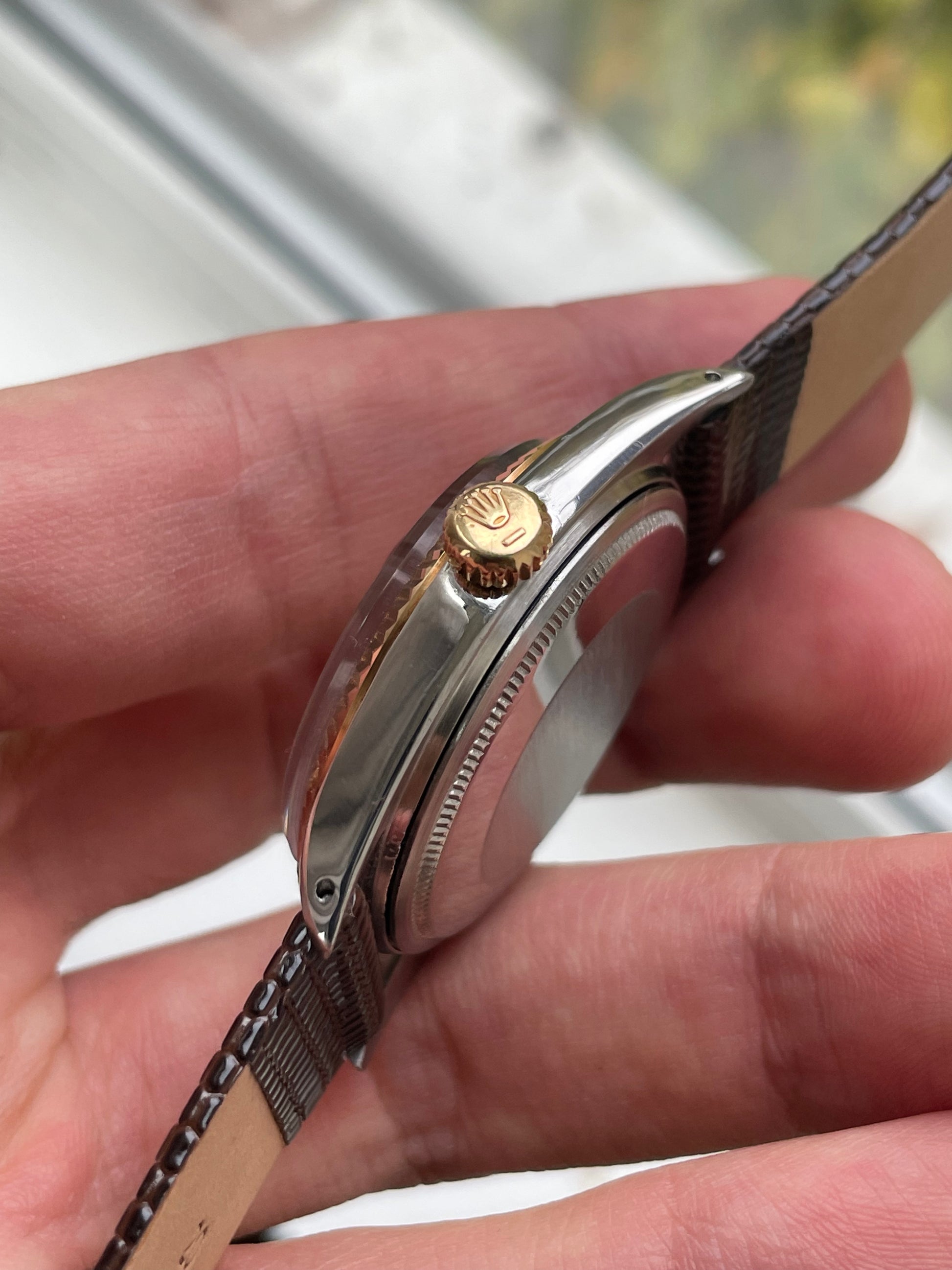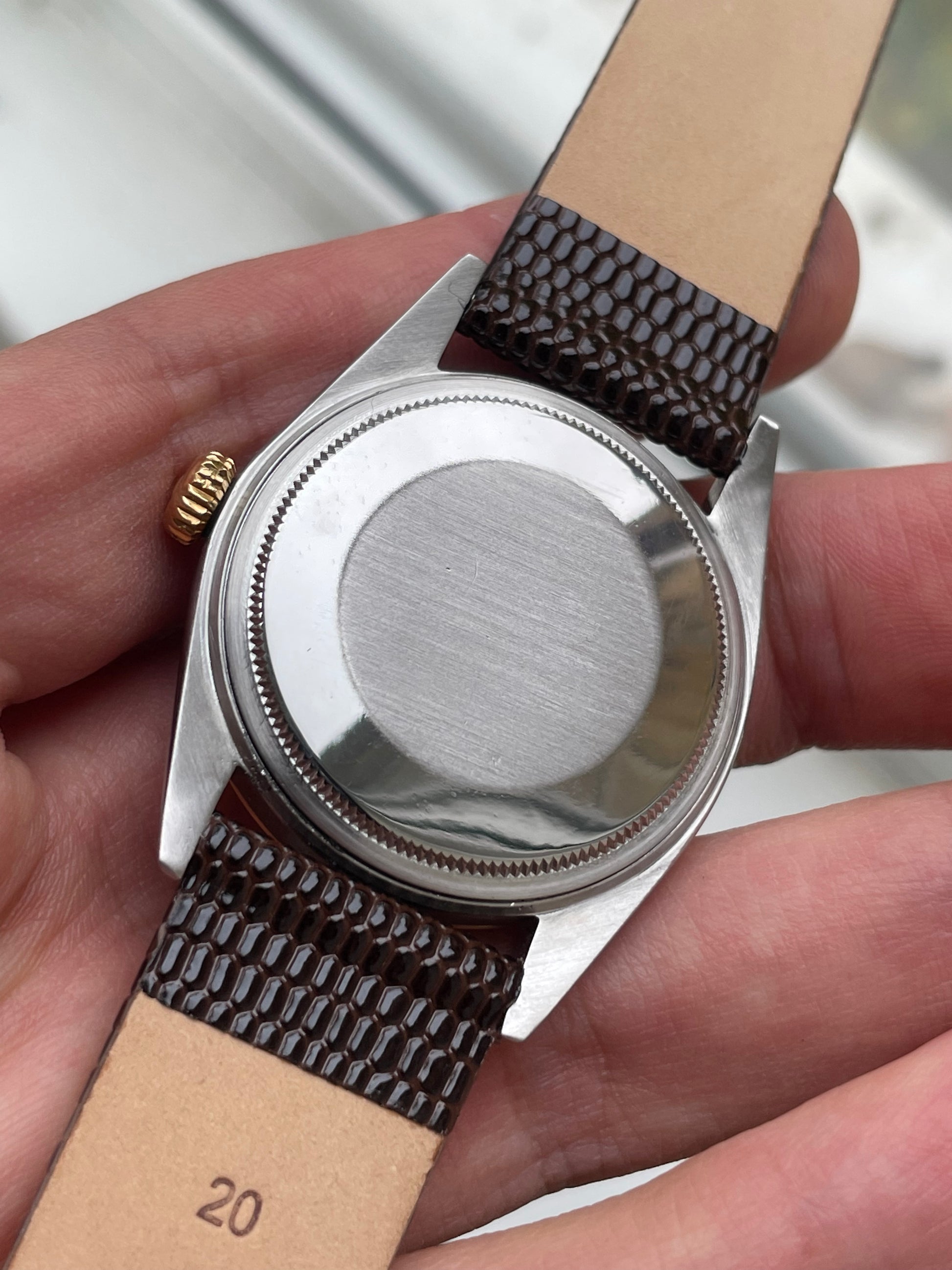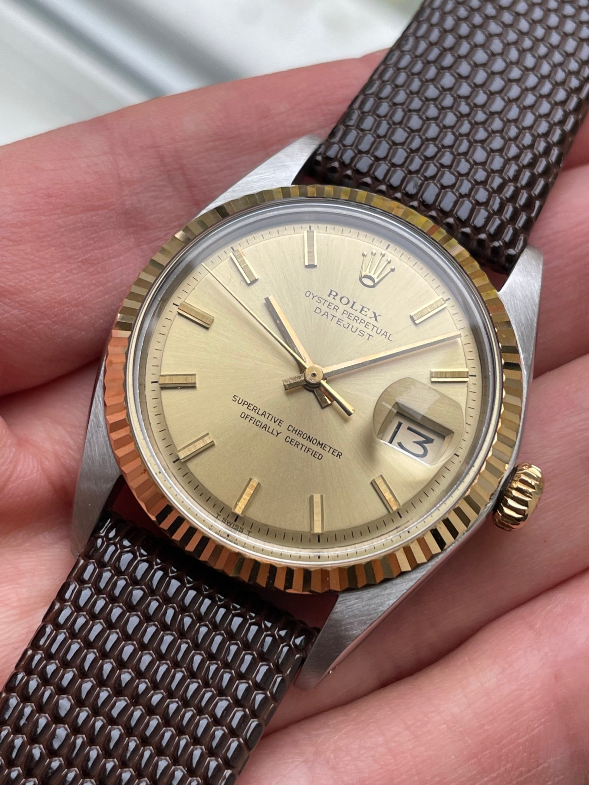 Alex's Comments: The Rolex Datejust was first introduced in 1945 and has been one of the world's most iconic watch models ever since. In some ways the Datejust is the perfect vintage Rolex and is an incredibly versatile watch, well suited to both newer vintage watch buyers and seasoned collectors alike. This 1601 is a nice example featuring a crisp, yellow gold fluted bezel and champagne non-lume dial. It's twinned to a brown leather strap offering a very versatile aesthetic.