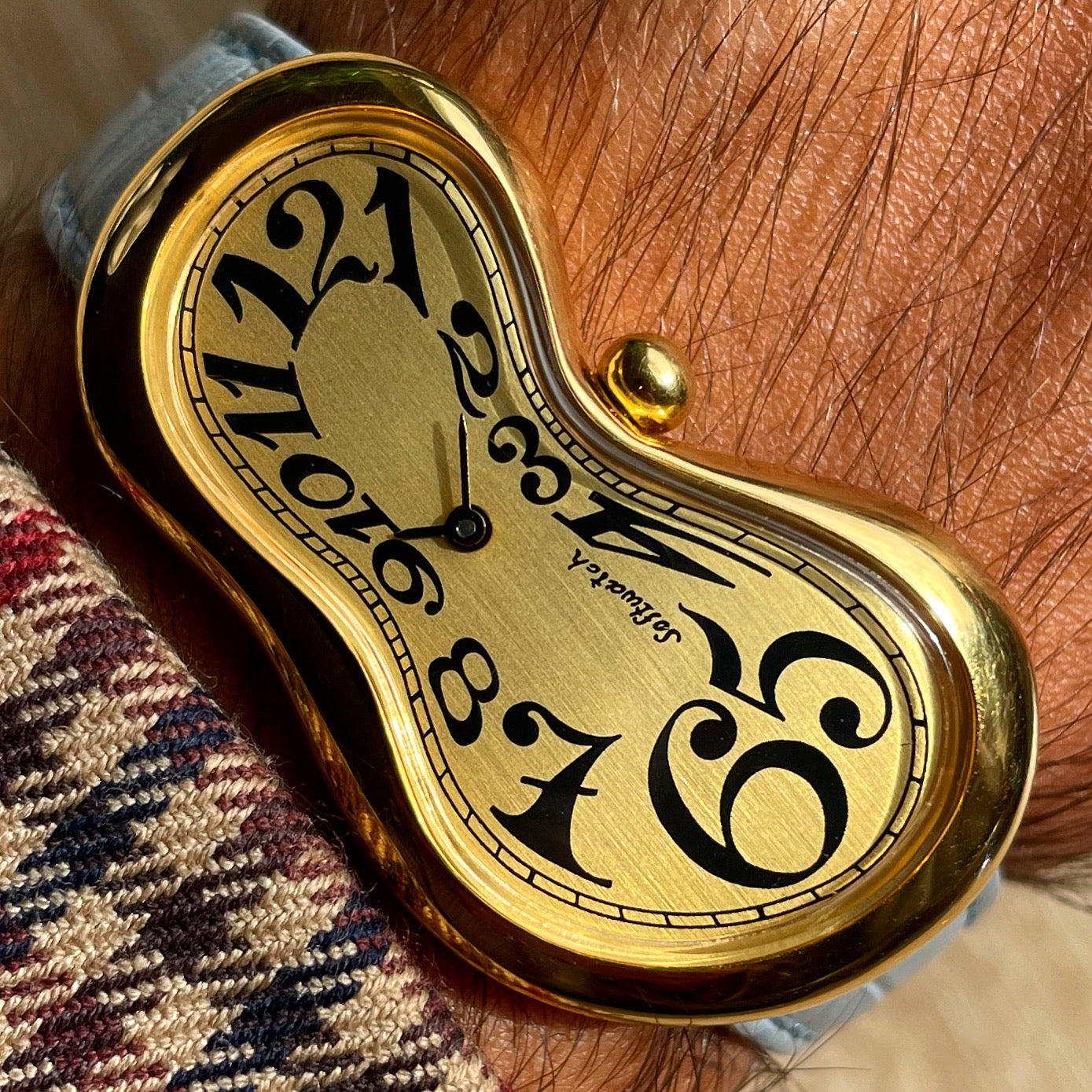 This Salvador Dalí Softwatch by Exaequo is inspired by Dali's painting "The Disintegration of the Persistence of Memory", and features a surrealist case design with Cartier-esque exploded Roman numerals to the dial. The Softwatch was first launched in 1990 and were made for a relatively short period, with Exaequo eventually being closed down in 1998 owing to a lack of permission to use Salvador Dalí's name on the watches. Softwatches have become a cult collectable watch given their unique design and history, and also offering a Cartier Crash-inspired look for less than 1% of the price.