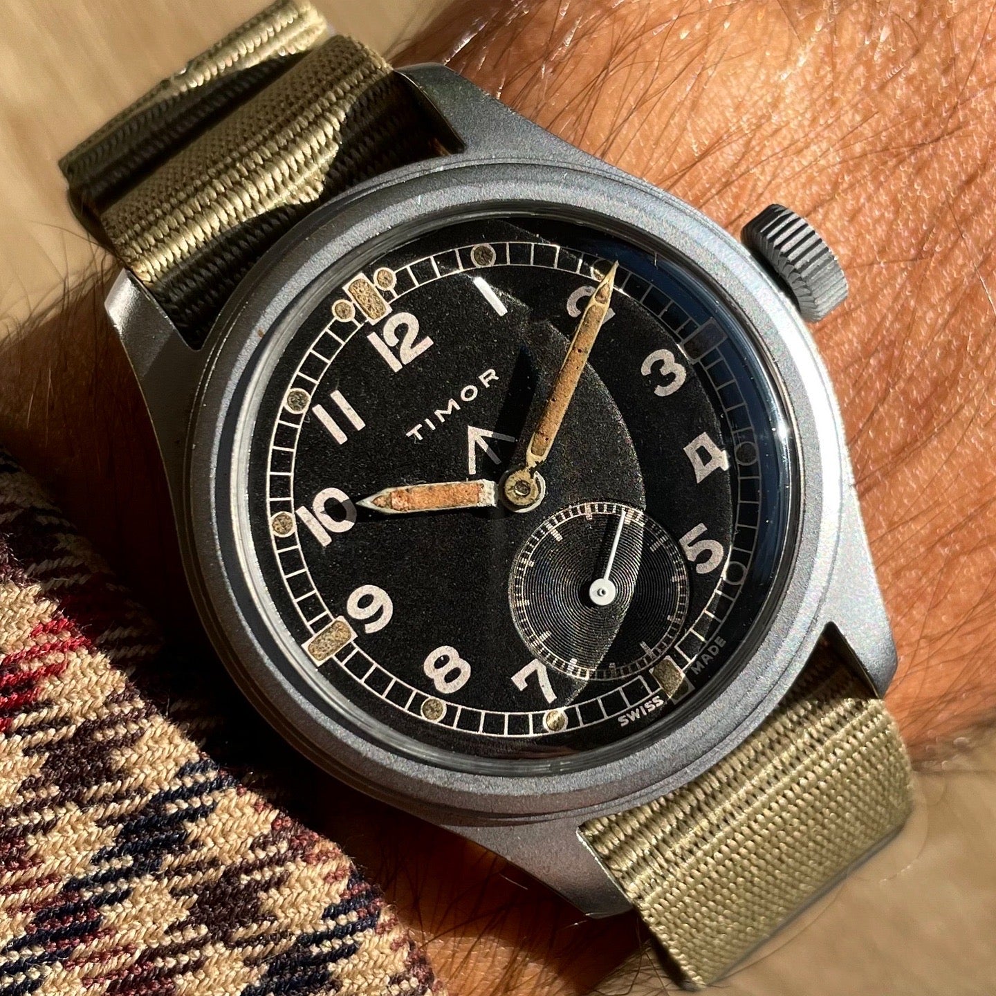 Alex's Comments: This watch forms part of the "Dirty Dozen" - twelve Swiss brands contracted to supply watches to the British Army, which began being issued in early 1945. These "WWW" watches as they are known (Watch, Wrist, Waterproof), were the first to be specifically designed and produced for the British Army and have thus become highly collectable and sought-after. Only around 13,000 Timor examples were issued and as such, being both scarce and collectable, good examples like this one are becoming harder to find. The case plating on this one is particularly well-preserved, and the watch has an attractive dial and hands. The key with military watches is condition, and I only sell good examples that I'd be happy owning myself!